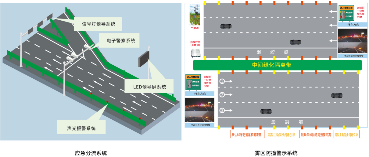 精準(zhǔn)能見度檢測(cè)并聯(lián)動(dòng)由破霧指示燈、車輛檢測(cè)裝置組成的防撞預(yù)警模塊,實(shí)現(xiàn)低能見度環(huán)境下的智能行車引導(dǎo)預(yù)防追尾
