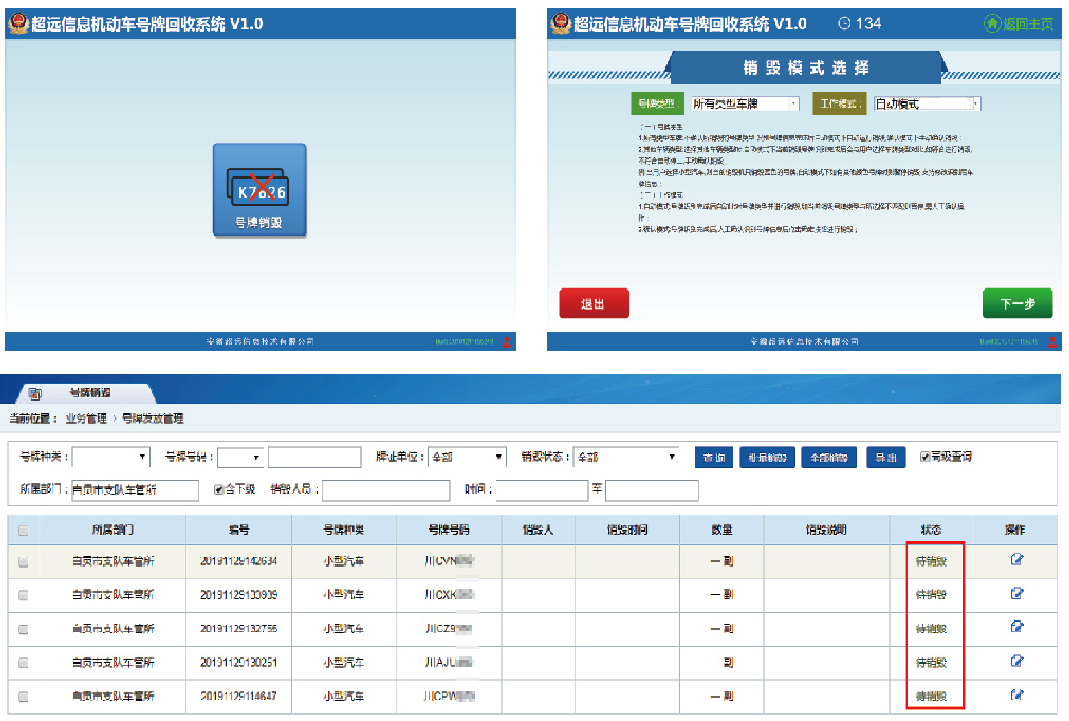 機(jī)動(dòng)車號(hào)牌回收銷毀自助機(jī)按照《機(jī)動(dòng)車登記工作規(guī)范》的要求,實(shí)現(xiàn)了機(jī)動(dòng)車號(hào)牌回收監(jiān)銷的工作。設(shè)備能夠?qū)?bào)廢過程全程記錄,與公安網(wǎng)(或其他專網(wǎng))相連直接將報(bào)廢號(hào)牌信息上傳系統(tǒng),方便報(bào)廢號(hào)牌的歸檔和查找。從而防止舊號(hào)牌存放期間的疏漏,嚴(yán)防舊號(hào)牌回流社會(huì),有效防止套牌等違法行為,提高了現(xiàn)場(chǎng)工作效率和車管所服務(wù)水平,規(guī)范了廢舊車牌報(bào)廢管理流程。