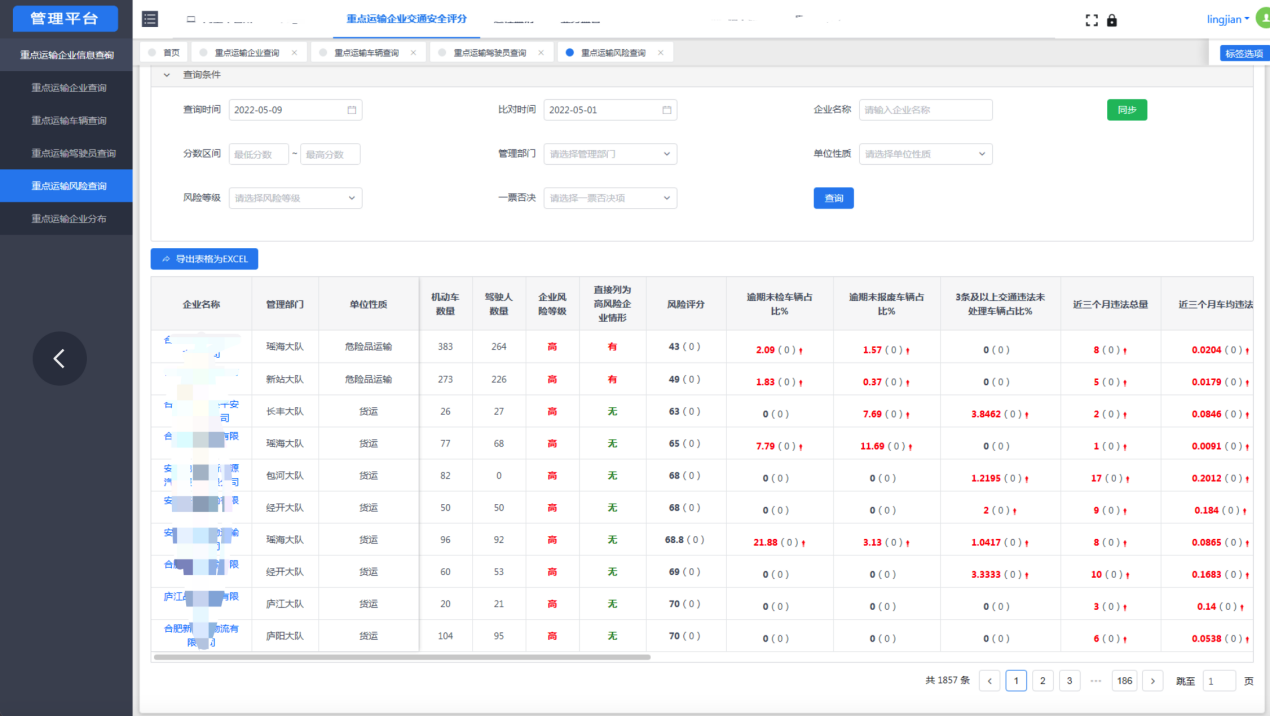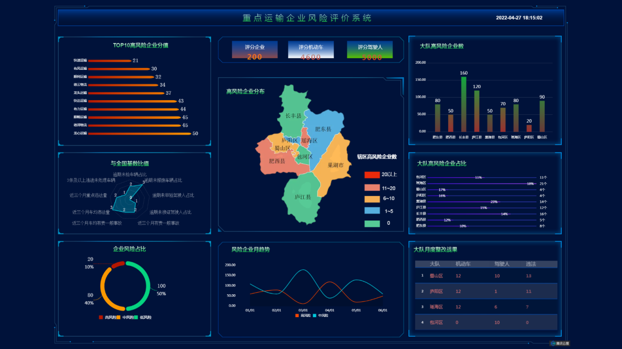 為提升全國(guó)重點(diǎn)運(yùn)輸企業(yè)風(fēng)險(xiǎn)管理的科學(xué)性、針對(duì)性、有效性,做到對(duì)重點(diǎn)運(yùn)輸企業(yè)進(jìn)行客觀評(píng)價(jià)和風(fēng)險(xiǎn)精準(zhǔn)預(yù)警,我司研發(fā)的減量控大”重點(diǎn)運(yùn)輸企業(yè)風(fēng)險(xiǎn)評(píng)估系統(tǒng),根據(jù)制定的交通安全風(fēng)險(xiǎn)評(píng)估對(duì)企業(yè)交通安全風(fēng)險(xiǎn)進(jìn)行評(píng)分,并按評(píng)分結(jié)果劃分為高中低三個(gè)風(fēng)險(xiǎn)等級(jí),對(duì)重點(diǎn)運(yùn)輸企業(yè)進(jìn)行風(fēng)險(xiǎn)畫像分析。