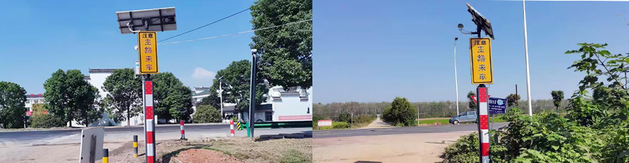外環(huán)北路與張圩路交口,屬于T型交口類型,采用我司太陽(yáng)能LED屏版本的道路安全預(yù)警系統(tǒng),當(dāng)支路行人、車輛通過(guò)檢測(cè)區(qū)域時(shí),預(yù)警系統(tǒng)及時(shí)提醒主路的行駛車輛,減速通過(guò)該路口。