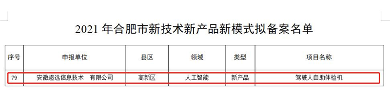 根據(jù)《合肥市新技術(shù)新產(chǎn)品新模式備案管理辦法(試行)》(合科〔2021〕171號)相關(guān)規(guī)定及要求,經(jīng)縣區(qū)科技主管部門初審?fù)扑]和市科技局復(fù)審等程序,并經(jīng)市科技局局長辦公會研究同意,超遠(yuǎn)信息“駕駛?cè)俗灾w檢機(jī)”產(chǎn)品通過新技術(shù)新產(chǎn)品新模式項(xiàng)目評審并公示。