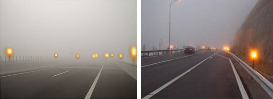 霧天公路行車安全誘導(dǎo)裝置采用先進(jìn)的事故主動防控技術(shù)、通訊鏈路及光能供電技術(shù),適用于城市道路、高速公路在霧天、強降雨、沙塵暴、煙霧等低能見度下的復(fù)雜環(huán)境,可長期連續(xù)陰雨日環(huán)境下正常工作,能與能見度檢測器、氣象設(shè)備聯(lián)動,自動啟動黃燈閃爍以強化道路的輪廊,并動態(tài)跟隨車輛閃爍紅燈,改善霧低能見度路段行車環(huán)境,引導(dǎo)車輛安全行駛,有效地防止追尾事故。