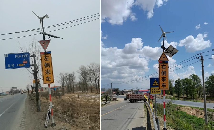 102國(guó)道與二西線交口(西地村),屬于T型交口類型,采用我司(簡(jiǎn)易版LED燈珠)道路安全預(yù)警系統(tǒng),考慮當(dāng)?shù)仫L(fēng)能充足,設(shè)備由太陽(yáng)能和風(fēng)能互補(bǔ)供電,當(dāng)支路行人、車輛通過(guò)檢測(cè)區(qū)域時(shí),預(yù)警系統(tǒng)及時(shí)提醒主路的行駛車輛,減速通過(guò)該路口。