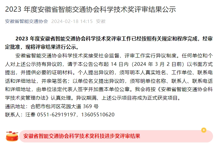 2月18日,安徽省智能交通協(xié)會(huì)發(fā)布2023 年度安徽省智能交通協(xié)會(huì)科學(xué)技術(shù)獎(jiǎng)評(píng)審結(jié)果公示,超遠(yuǎn)信息與合肥工業(yè)大學(xué)、安徽省智慧數(shù)城科學(xué)技術(shù)有限公司聯(lián)合研發(fā)的《農(nóng)村公路交叉口交通安全預(yù)警與信號(hào)控制一體化系統(tǒng)》榮獲二等獎(jiǎng)。