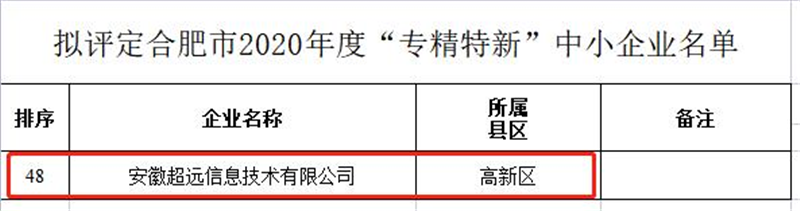2020年11月4日,合肥市經(jīng)濟(jì)和信息化局公示了2020年度“專精特新”中小企業(yè)名單,超遠(yuǎn)信息位列其中,又添殊榮!